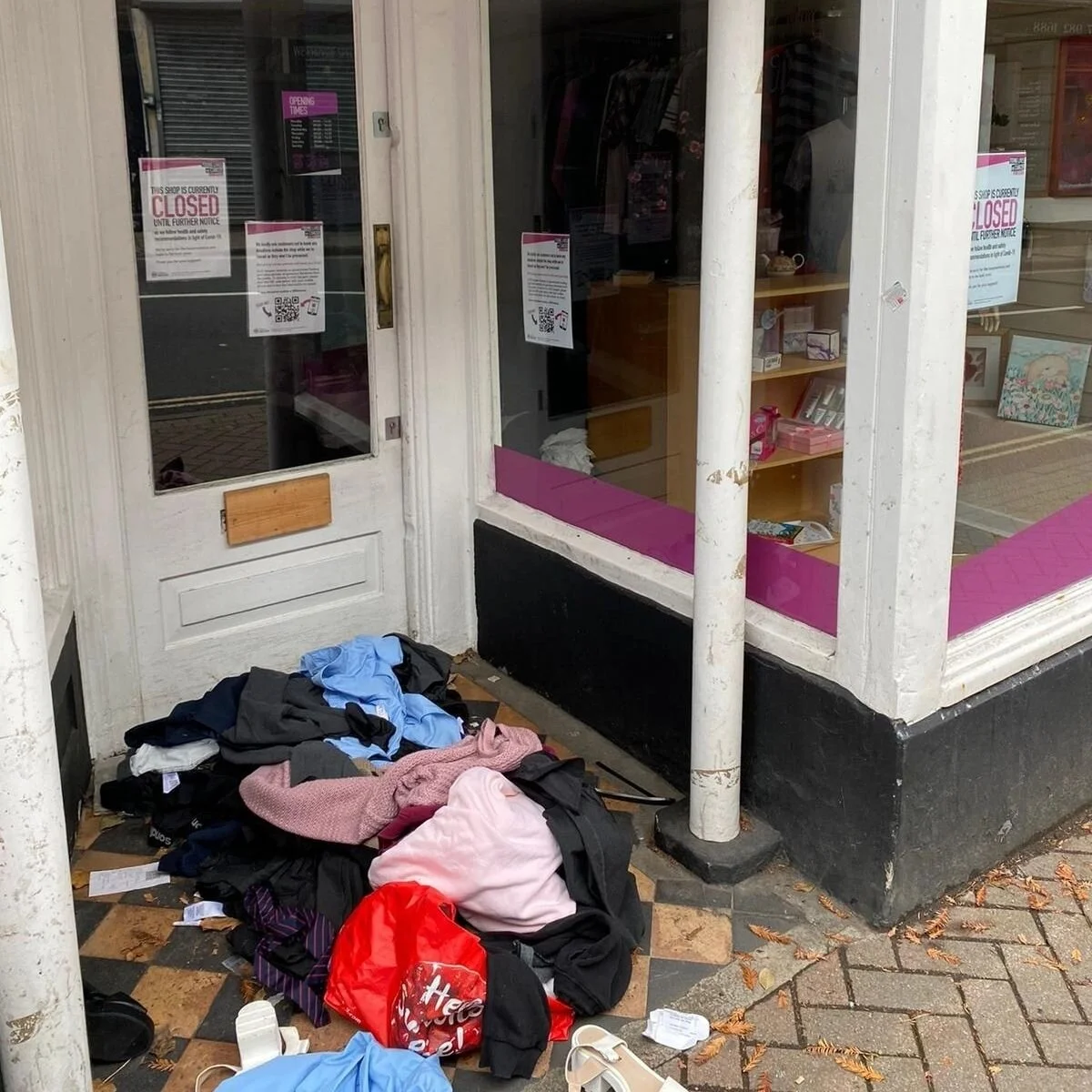 My friend asked me for some advice on where to take some clothes and she sent me a similar photo. A charity shop, which had multiple signs in the window stating that it was closed until further notice, with a bag of clothes that had been left outside the shop, which had then started to be strewn across the street.